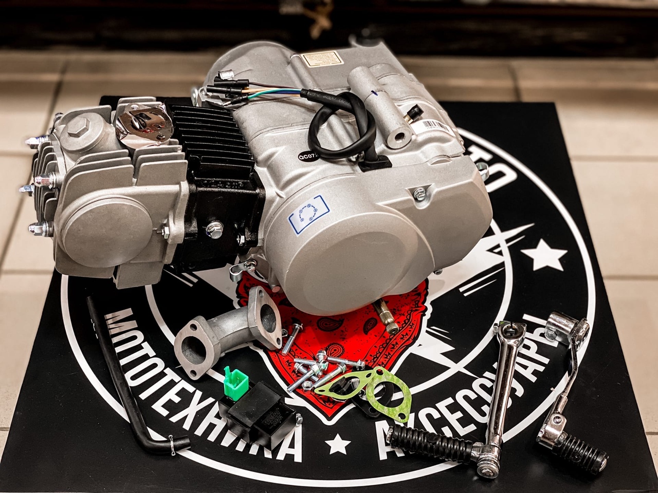 Комплектация: двигатель в сборе, впускной коллектор, CDI, рычаг кикстартера, рычаг переключения передач.